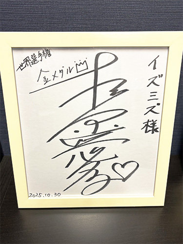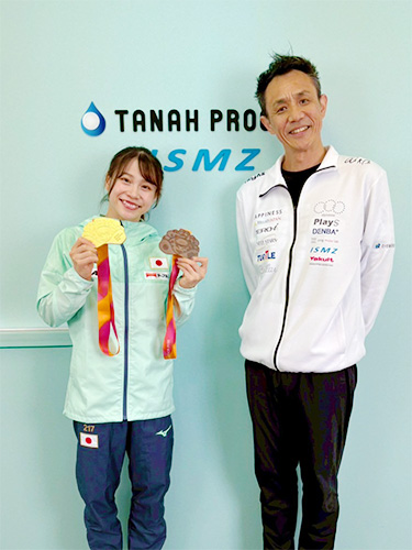 心よりお祝い申し上げます。本当におめでとうございます!ご帰国後、さっそく弊社にご報告にお越しいただき、誠にありがとうございました。手に取らせていただいた金メダルは、想像以上にずっしりと重く、杉原愛子選手の努力と栄光の重みを感じました。